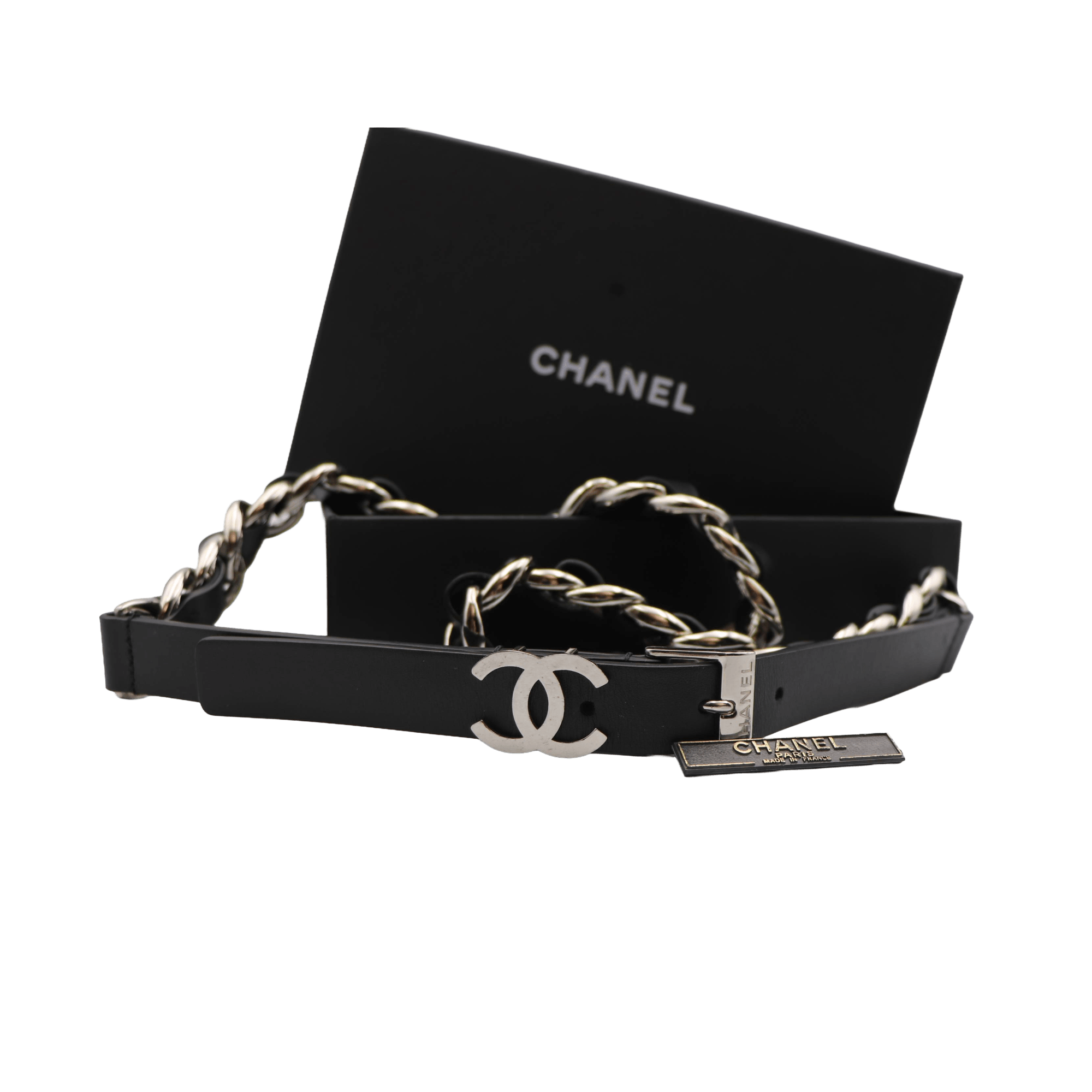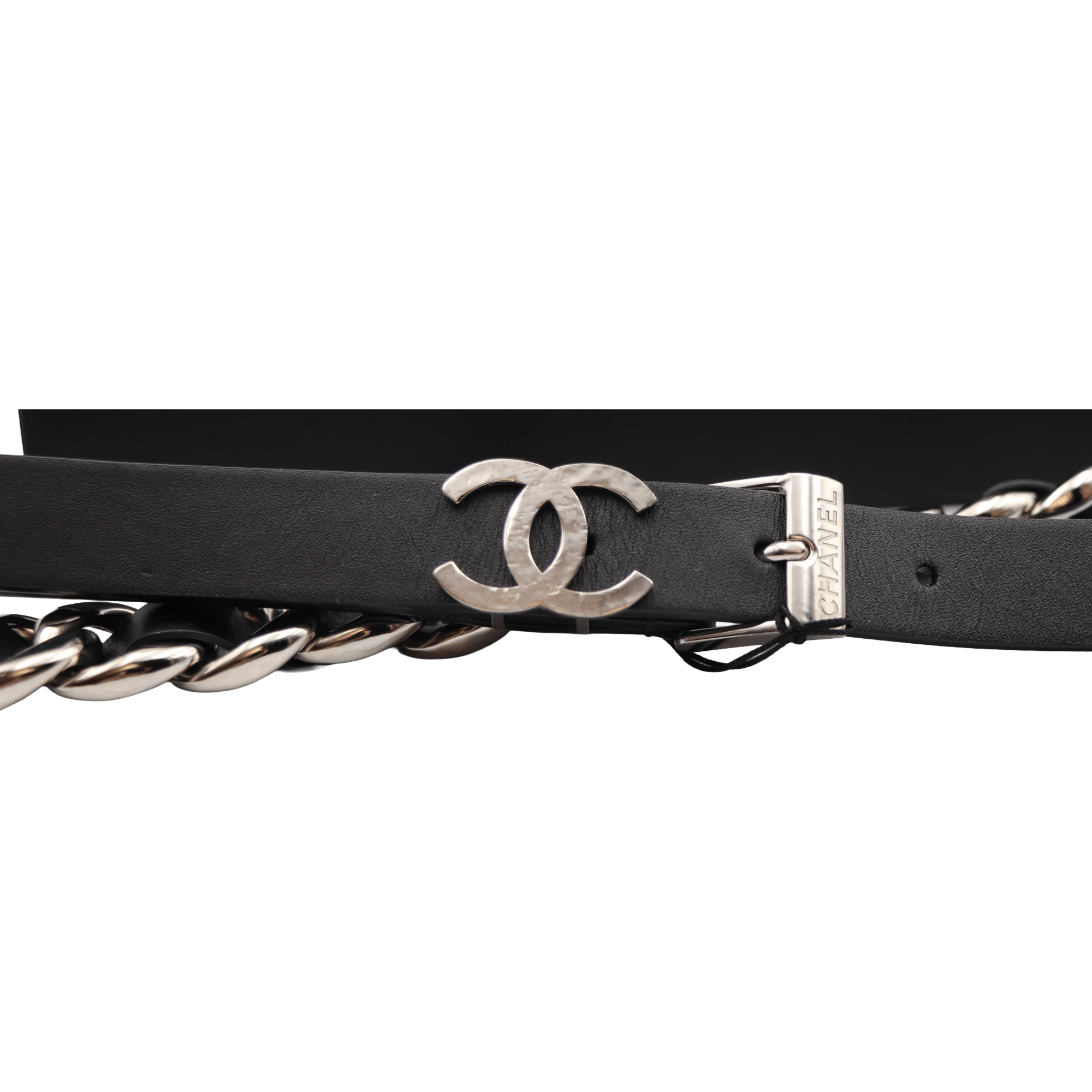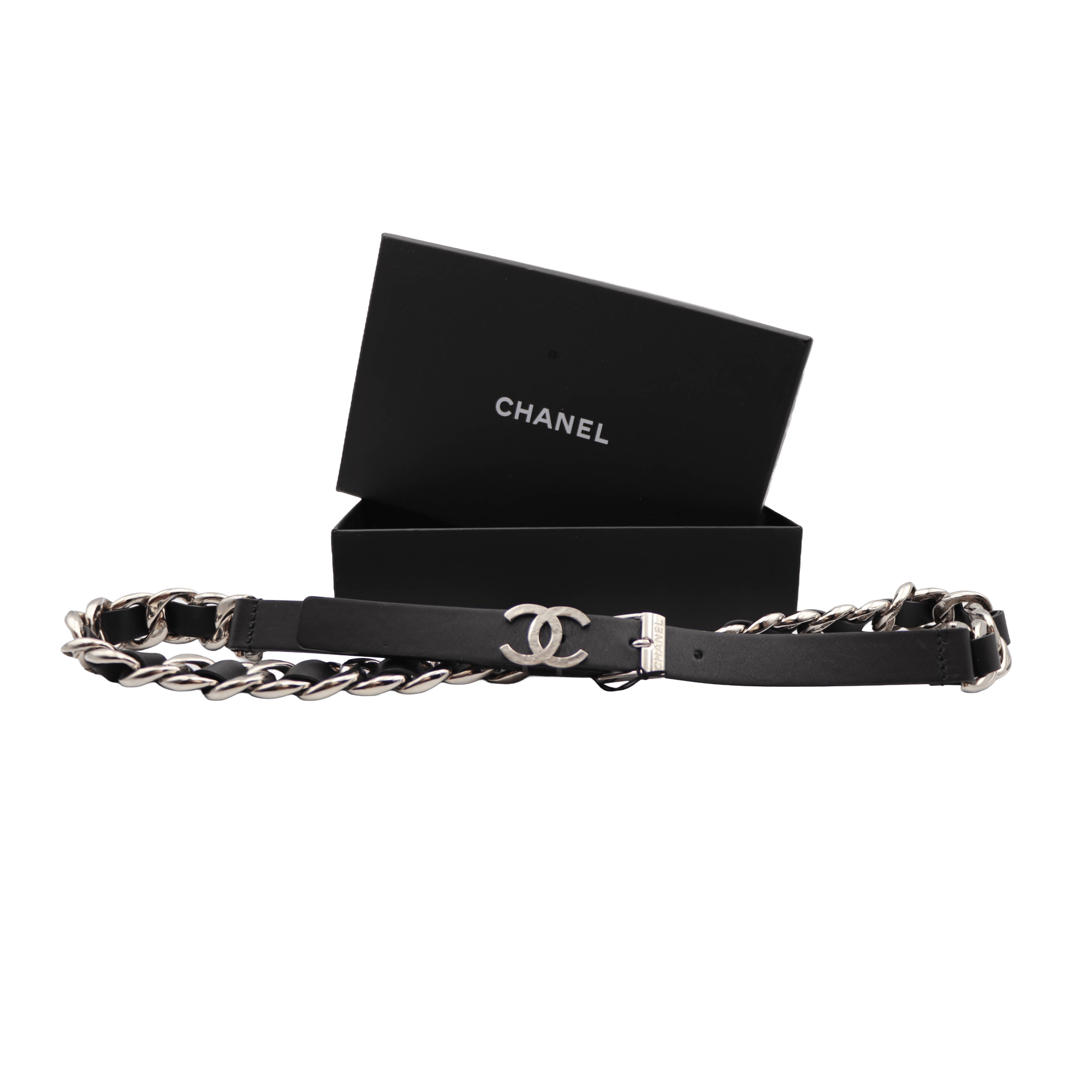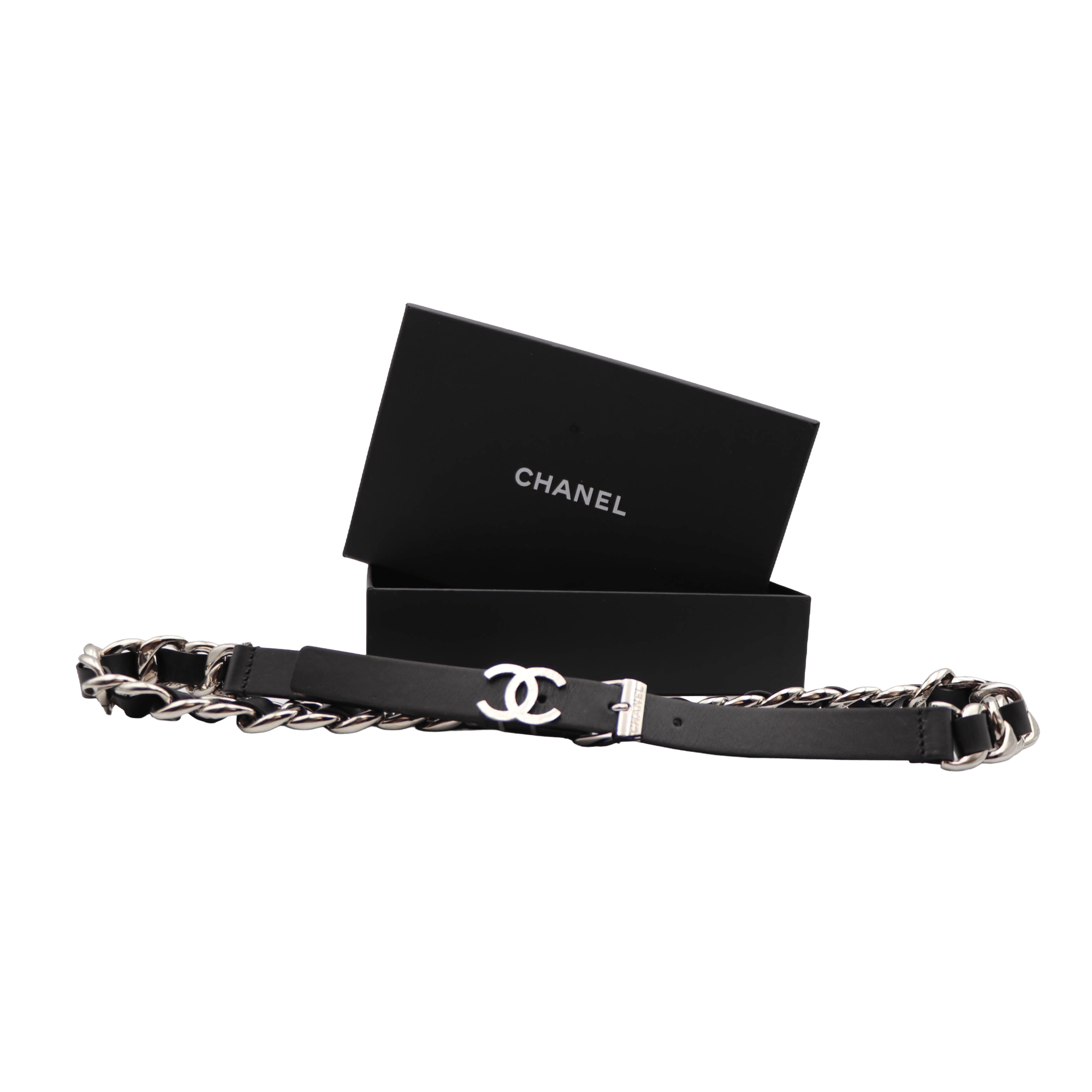 Cinto Chanel novo com fivela em duplo C ligeiramente martelado e corpo em pele de cordeiro preta entrançada em corrente prateada. Esta peça revela a elegância da Maison Chanel, graças ao seu design clássico e intemporal. Um acessório raro no mercado, ideal para acrescentar sofisticação e identidade a qualquer look.