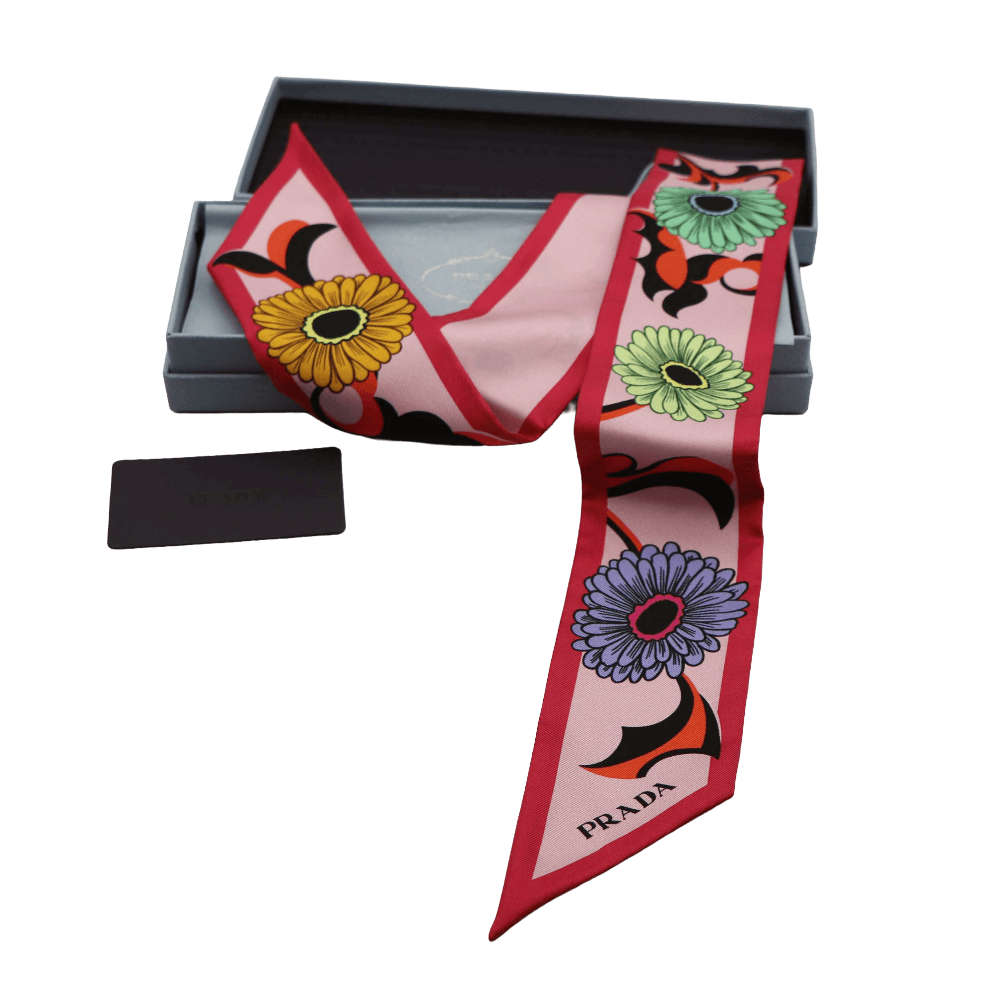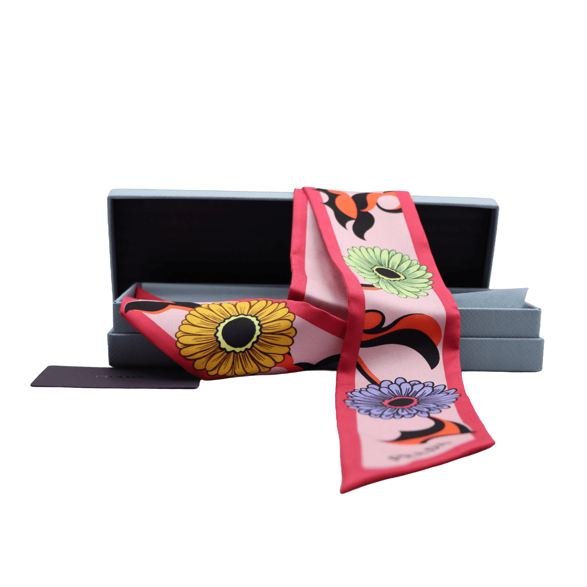 Twilly Prada em seda, em tons de rosa, com estampado floral em tons pastel que combinam na perfeição. Ideal para acrescentar um toque de sofisticação ao look do dia a dia, com a elegância delicada característica da Maison.